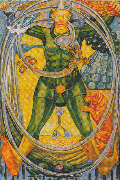 The Thoth Devil, looks down on us with a humorous smile on his face, for he is the Lord of Illusion. He is the card of Capricorn, a sign associated with the making of money in order to gain security, and which, of course, is in itself an illusion. The Devil smiles at the weakness and self enforced slavery of our human frailty, and we curse him as the begetter of sin and the demon who imprisons us with his wicked ways.