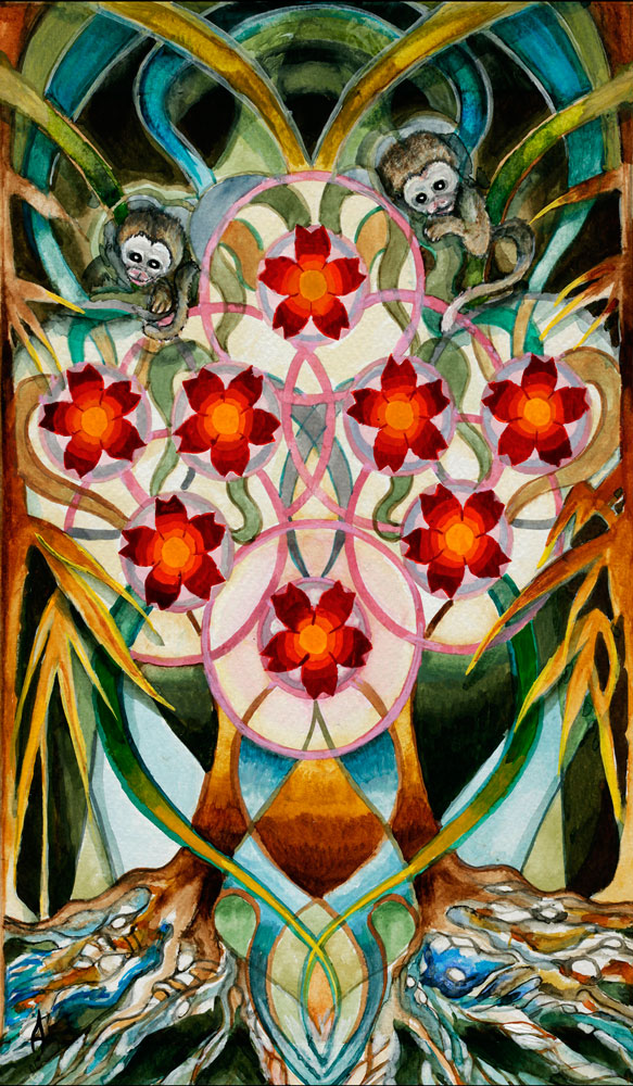 High up in the trees she sees chattering monkeys clambering around in the canopy far above her head, their voices drifting down to her in a cloud of happy conversation, telling her stories whilst she is walking. As she continues, they explain what is happening, so at no time does she feel afraid or unsure in this calm place beneath the trees, and although she cannot see very far she feels reassured by what the monkeys are telling her and happy to carry on her way. After a while she comes to a large clearing where a magnificent tree towers above her, reaching way above the forest canopy into the sky, to a place that she cannot even see it is so far away. Stately and noble, its roots stretch deep into the earth all around her feet, and she gets a sense of the darkness beneath her, the solidity of earth and how the roots, although invisible, are the most vital for the trees survival. There would be no tree without the foundation, so although she cannot see the roots, she recognises the essential nature of their presence, and that their health and strength is the key to the eventual success of the tree. She sees that it can take many years where it may feel as if nothing is happening at all, but that this is not to be seen as failure, but as root formation, for without constant challenge and effort, like a tree weathering the storms of life, how can we form the character and tenacity required to support success, support the outcome.