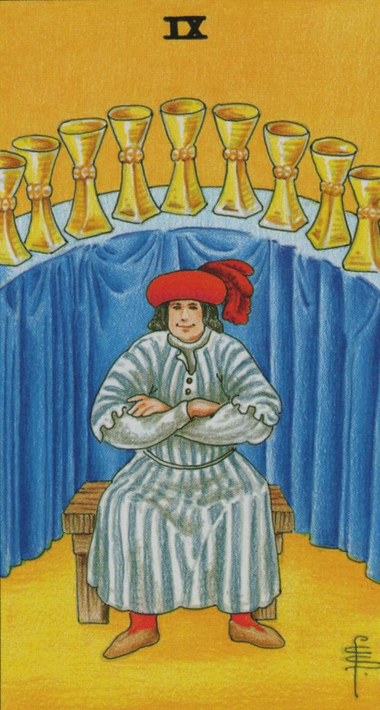 The figure below, shown from the Waite Smith “Nine of Cups” shows a man content with what he as, yet he is alone, apart from the 9 cups, that show the care and attention that is his to give, for his emotional store cupboard is full. This card, and its predecessor, the 8, which initiated this cycle, remind us of the hopelessness of feeding continuously, an emotional situation that can have no resolution, and to do so, is to deplete ourselves so that we have nothing left to give…. and our mirage, or fantasy collapses, the battery is flat, the power is spent.