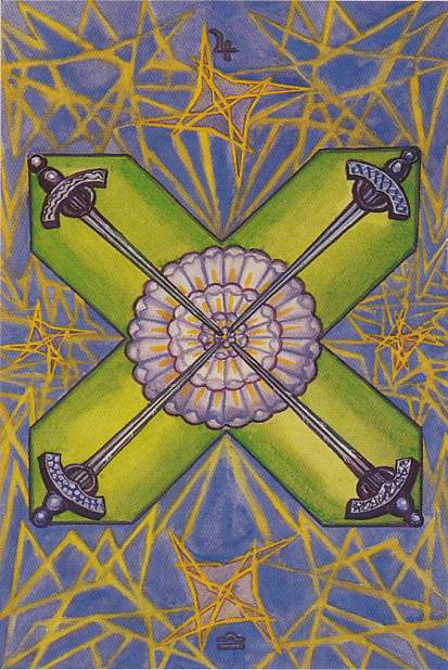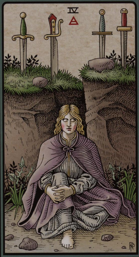 The image shown from The Alchemical Tarot by Robert Place, on the left, clearlyshows the need for rest and recuperation, the need to withdraw from the world and seek “inner balance” and “healing” that is traditionally associated with The Four of Swords. Beyond this idea however, seems to be the requirement for a balancing of energies between the emotional, the spiritual, the mental and the practical, Water, Fire, Air & Earth, in order to discover the equilibrium necessary for this process of inner balance.