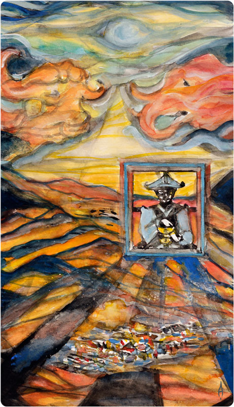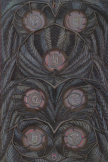 The secret of this card, I feel, is the challenge of developing the story, to carry on from the foundations that have been laid, in the face of both fortune and disaster. No matter how well we may tend a garden and nurture our plants, it is the forces beyond our control that may, if we are unfortunate, wreak the greatest havoc and lay all our loving work to waste. Through such experiences, both great and small, over which we apparantly have no control, we develop an inner strength and maturity that helps us to develop the foresight and wisdom necessary to weather the storms that face us, and the humility to offer prayer, reparation or to seek practical assistance, so that our work may come to something that we would be proud of. Such trials and experiences help us to develop a deep inner resiliance which in it’s action, ties us ever more closely to the rhythm of the earth.