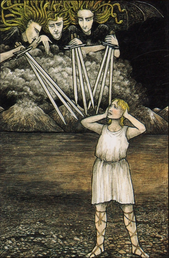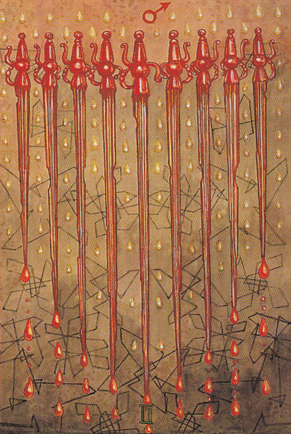 The card of The Nine of Swords is not a happy card, often depicting a dark morass of confusion which results from the inability to reconcile dualities within oneself and within the world. There is certainly despair here, born of the struggle to reconcile warring factions within the self; not denying either voice, but allowing both side to have their say, for to deny one above the other is to deny part of our creative drive. The mind which can come to accept these oscillations between extremes can eventually come to understand the whole of the interaction, and being unbothered by either, knowing the other awaits its turn. The mind can thus attain, according to Agrippa, โinfamous and dishonest agility, as that of jesters and jugglersโ