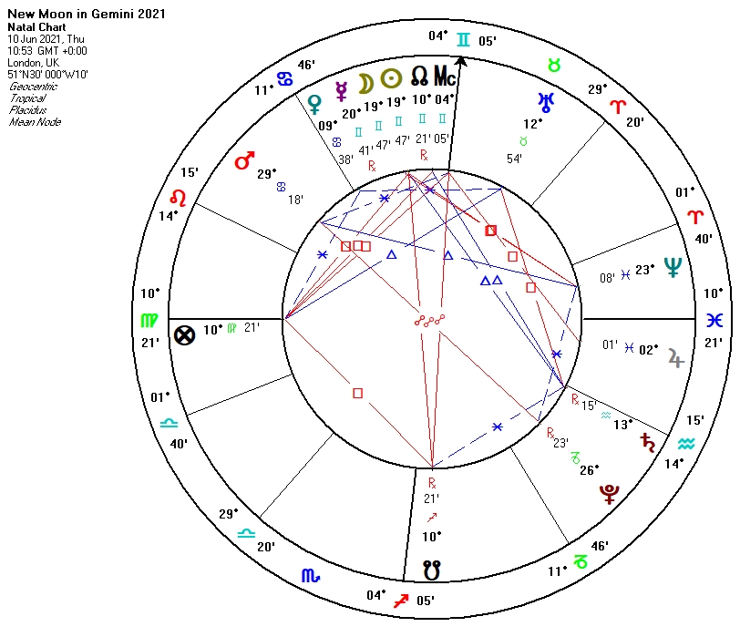 This New Moon falls in my own 12th House, the house of hidden matters, this, together with the retrograde emphasis in the skies at the moment suggests that I might be doing some retrospective work and digging up the past. My focus this month will actually be the celebration of the Summer Solstice, when I will be lucky enough to share it again with Constellation Camp Ireland at their annual gathering in Wicklow. As I wind down my own personal solar year, I wonder what ancestral stories will step forward to be examined at camp this year, it will be interesting to see what unfolds… quite a fitting time after all, I think, for this kind of work.