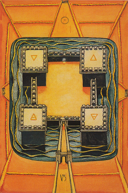 The center card, the Four of Discs, ruled by the Sun in Capricorn, speaks of the need to assume “personal power”, which is where I believe the current challenge lies, if we are to escape from the “inferno” depicted at the bottom of The Devil. Too long enamored of the opinions of those “at the top”, “in the know” or “in authority” maybe the time has come to assume control of own lives, because in truth, we are not, how can we be? Raised for the most part to think small, fit in, and to remain within sharply defined parameters, the ones we were passed by our parents, The Devil smiles down on us, the little people; terrified of our own power, we give it away to those who we believe to know better.