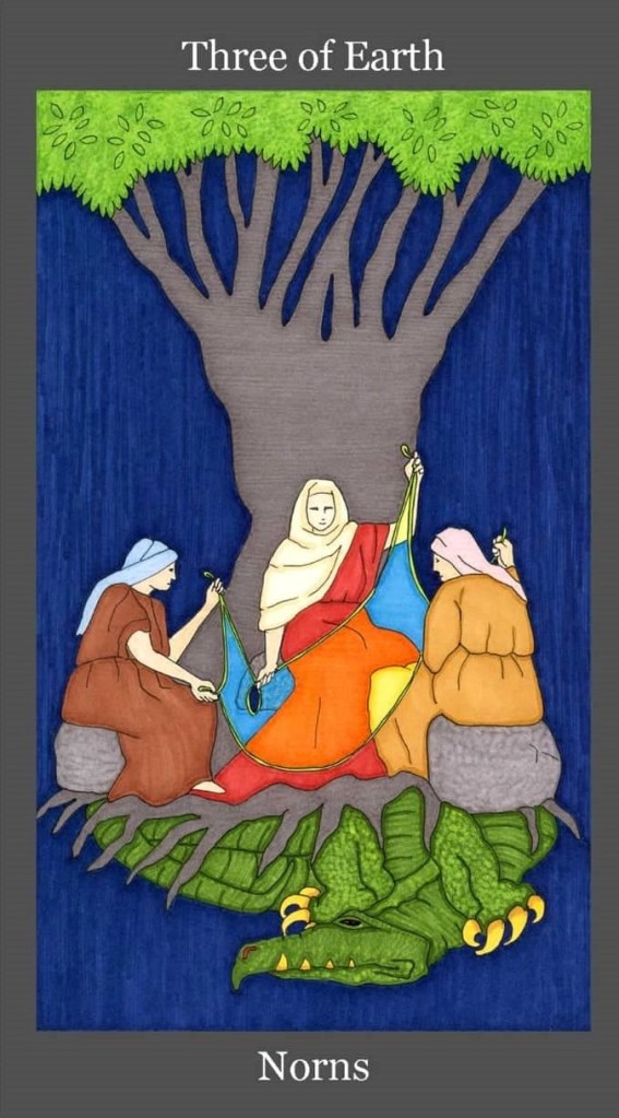 I love this interpretation of the Three of Earth, such a comforting and wise image, reminding us of the circle of fate and the nature of destiny. They speak of what has been, What is becoming and What shall be. Fate however is of the past, because nothing is written absolutely and even the gods cannot escape their destiny. Remember that your fate will be in part what you shape it to be, it is an important focus.