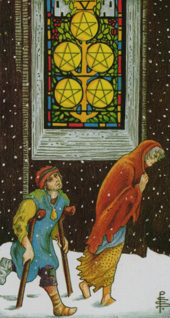 Th second card, associated with the first decan of Taurus, is the 5 of Pentacles, showing two figures, perhaps a mother and a child, in ragged clothes and limping through the snow. They look very disheartened; have they been thrown out of the building they are passing, the building filled with light, or are they ignoring its presence?, it is difficult to know.