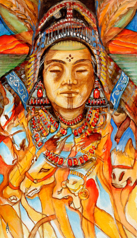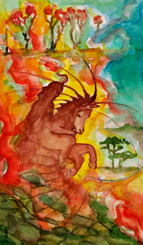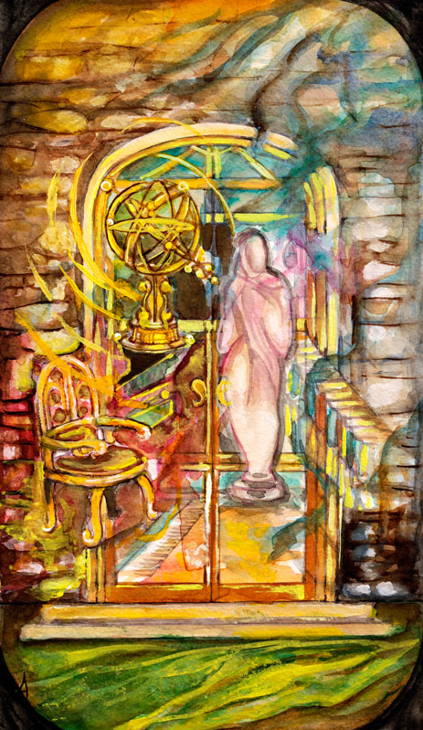 A woman sits there, speaking quietly into the wandering wind, and she watches as a caravan of camels travels obediently towards the horizon. ‘Go back; make your heart strong, fill it with dreams before your return’ murmurs the sahira, ‘the heart does not like to be denied, but it must be strong to cross the desert’. The words play around her head, echoing in her ears, plucking at her hair, getting stronger and stronger, until the wind blows with force through the temple, taking the sahira and the camels with it. The sand rises in the strengthening wind, and she finds herself in an empty ruin, all that remains of the glorious temple that was there just moments ago. Her gaze follows the wind into the endless sands and loses itself in the ochre splendour of the desert until she discovers her still body once again, seated and safe in the silence of The Hallway of Beginnings.
