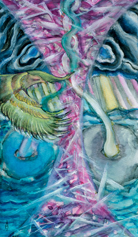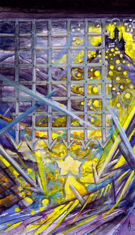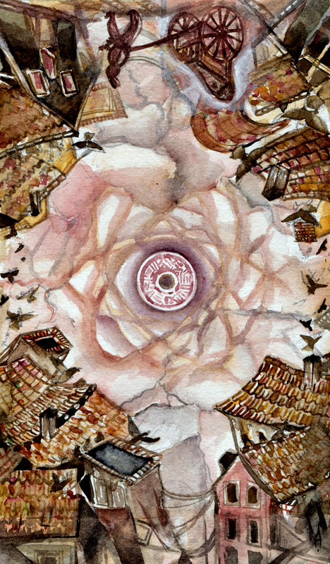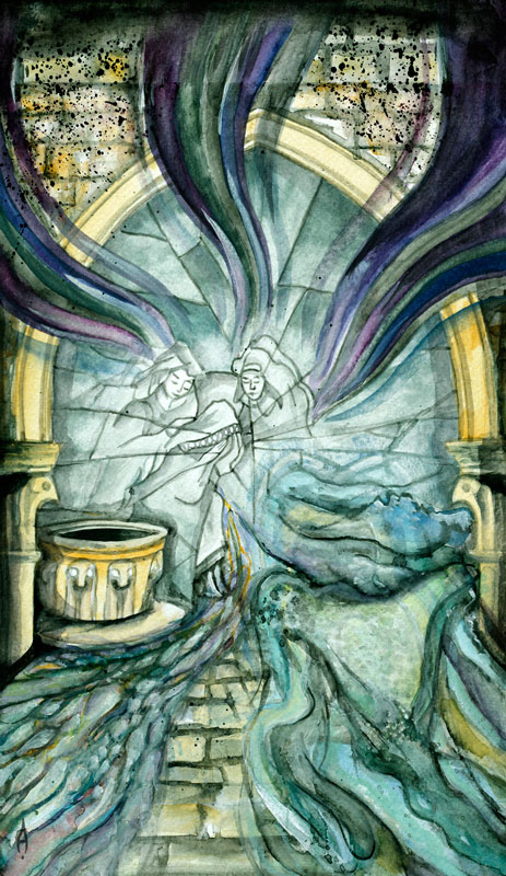 Day has followed day, and already a year has been constructed around her travels into the faraway places beyond the ancient brass bound door; a year of stories etched into her mind, moulding her thoughts and eventually her life into new shapes and colours. It has been a year where some things have died, whilst others have been born, some painfully with screams of anguish and terror while others have come with the quick breath and rush of a beating heart that tastes the first cold water of the summer seas. She yearns for the still point, where all things will be suspended, where her cells can drift beyond gravity, and she will hear a clear note on a clear day of purity, peace and perfection.