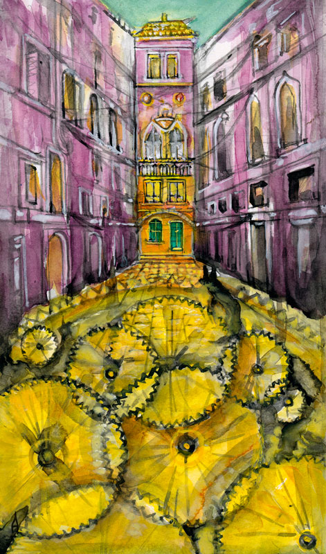 As she stands watching this beautiful scene, an angular and somewhat elderly man with skin the colour of old mahogany trots purposefully around the corner as if he has been summoned and stops in front of her with an elegantly carved rickshaw. It seems that the conveyance is for her, so she climbs in, and as soon as she is in the seat, the man takes off at a rapid pace; his strength seems surprising, and without any discussion, he carries her deep into the city.